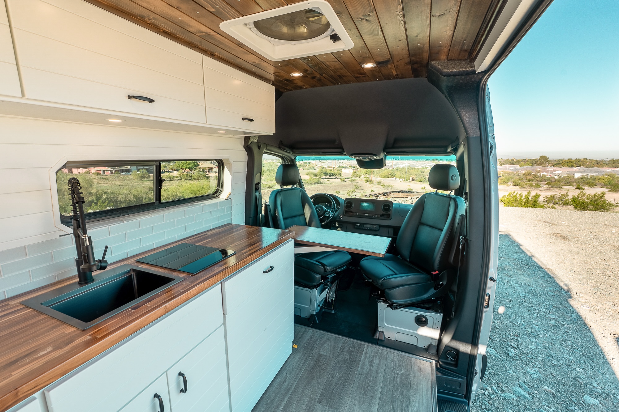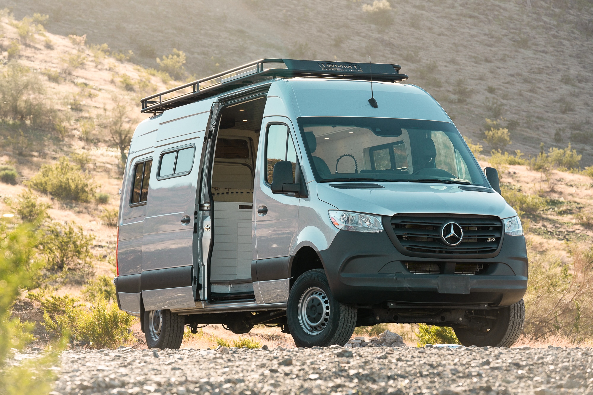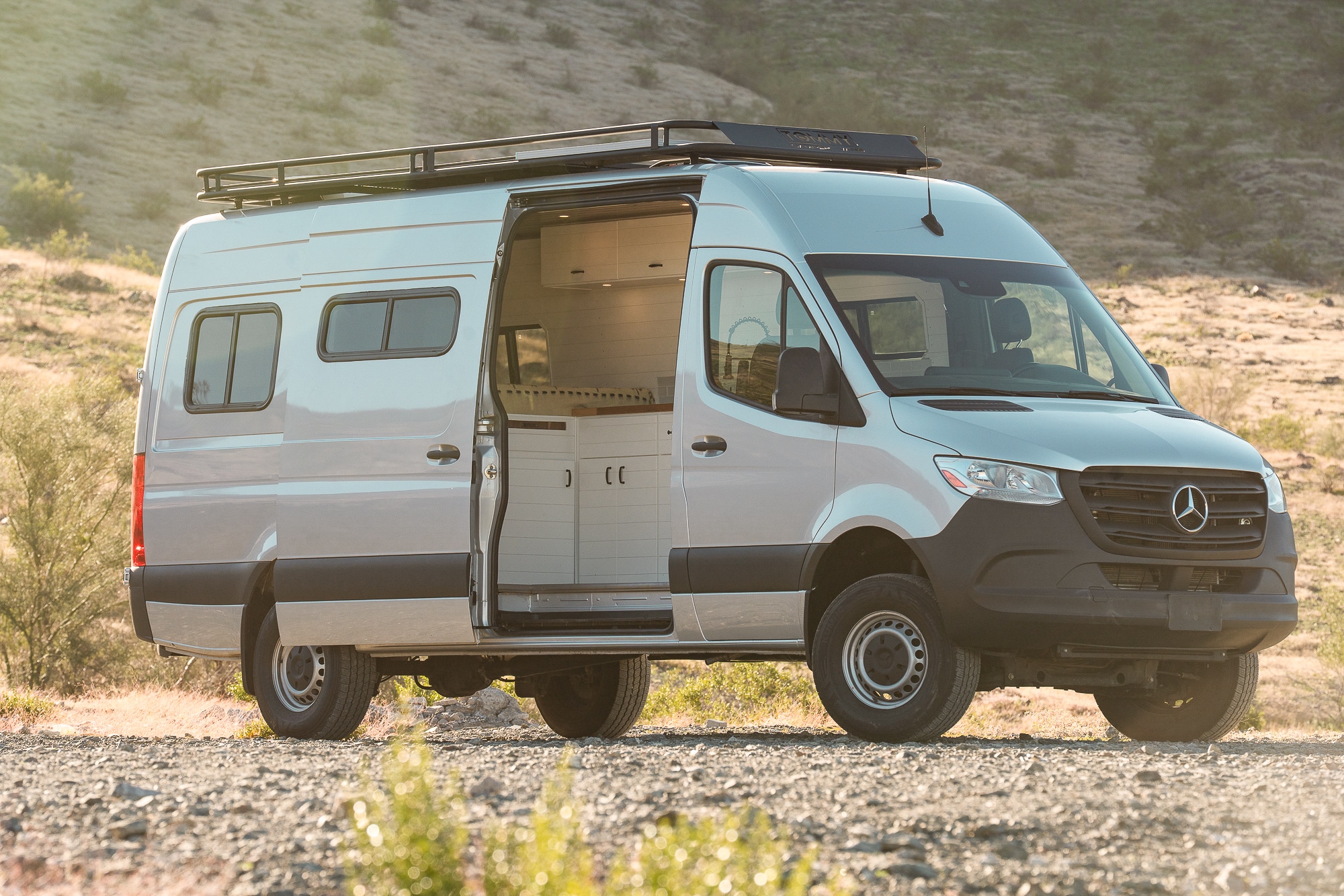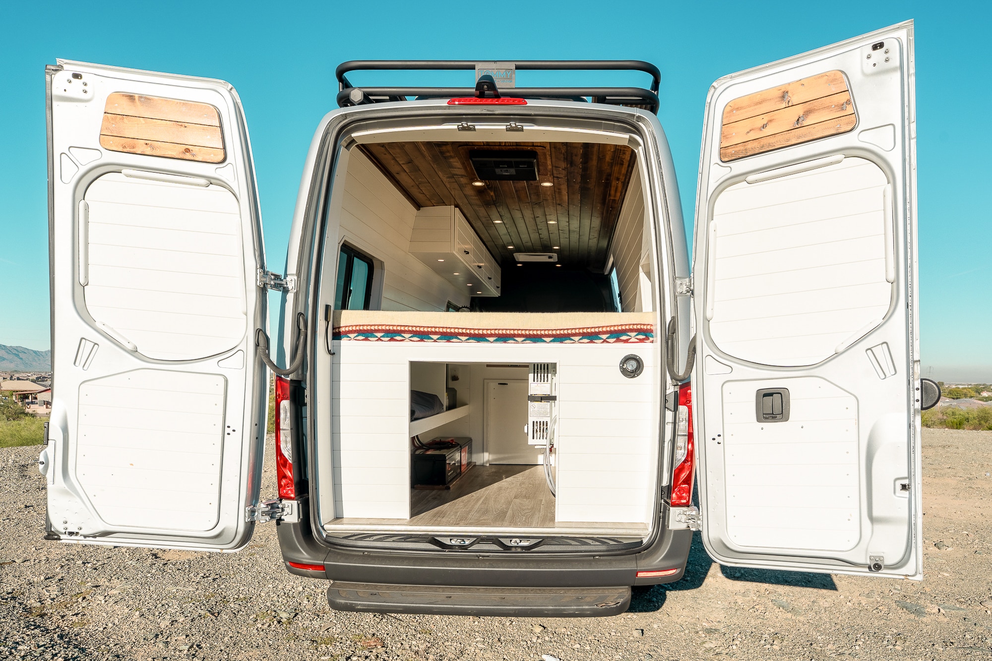 2022 Mercedes Sprinter highroof 170WB EXTENDED! This beauty features a Tommy roof rack where the solar panels are stored, along with a wooden deck for stargazing. VAN HAS 52K ORIGINAL MILES! Clean carfax- Arizona rust free!
